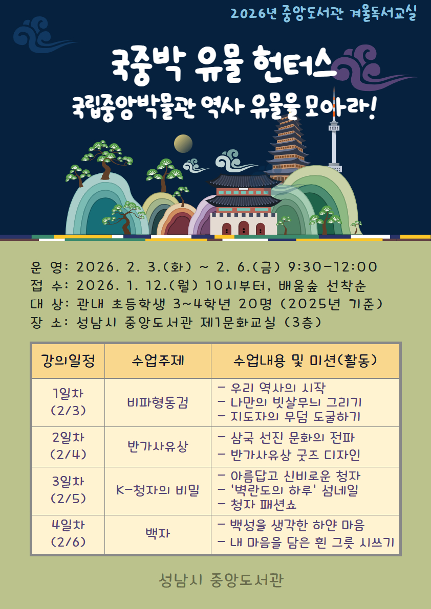 ![]() [ 2026년 중앙도서관 겨울독서교실 안내 ] ☐ 운영일시: 2026. 2. 3.(화) ~ 2. 6.(금) 9:30-12:00 ☐ 모집기간: 2026. 1. 12.(월) 10:00 ~ 마감시 ☐ 운영대상: 관내 초등학생 3~4학년 20명 (2025년 기준, 2015년~2016년생) ☐ 모집방법: 평생학습포털 배움숲 온라인 선착순 모집 수강신청 바로가기 클릭 ※ 미리 ‘성남시 배움숲’ 회원가입 후 수강신청 가능 ※ 수강할 어린이 ID로 로그인 한 후 수강신청 ※ 수강생 휴대폰 성남시립도서관 어플리케이션 설치 (도서대출용 모바일회원증 필요) ※ 자세한 내용은 배움숲/강좌선택/수강신청/강의계획서 참조 ※ 문의 : 중앙도서관 자료정보팀(☎031-729-4633) |